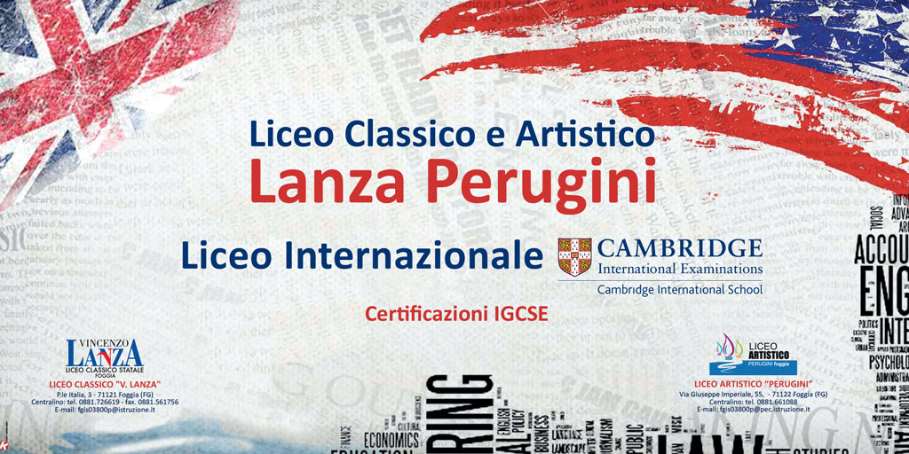 Il Liceo Lanza-Perugini ha realizzato un progetto di attivazione nell’ambito degli studi classici diun percorso internazionale che ha avuto nelmarzo 2017 l’approvazione da parte dell’Università britannica di Cambridge. (www.cie.org.uk)