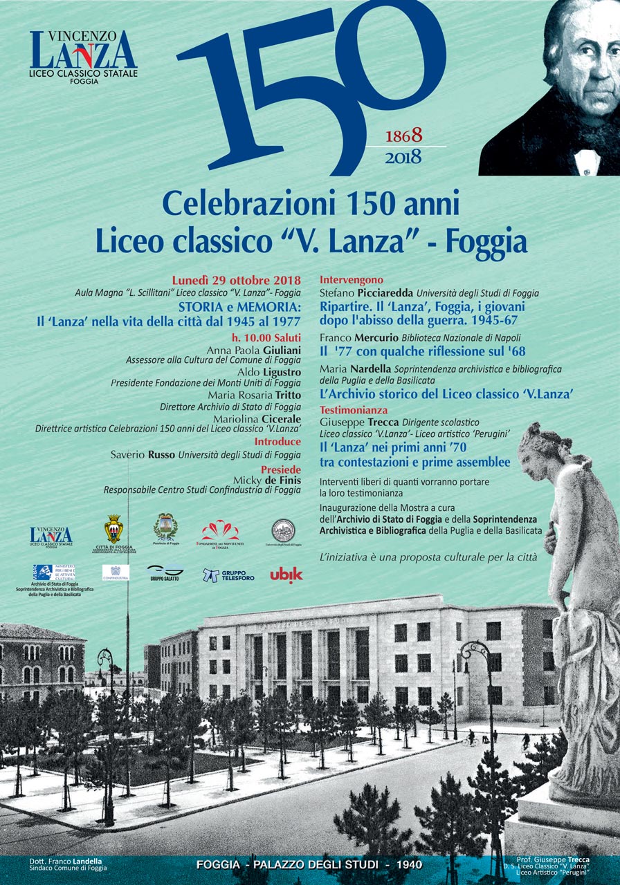Quando il Preside del Liceo classico ‘Lanza’ di Foggia mi ha affidato la Direzione artistica delle Celebrazioni dei 150 anni del Liceo classico ‘V. Lanza’ di Foggia, una scuola da lui felicemente definita ‘dal cuore antico’, il mio cuore si è messo a battere a 1000: ideare e organizzare momenti significativi per la vita del ‘Lanza’ non si sta rivelando impresa semplice.