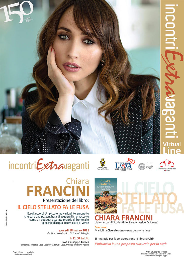 CHIARA FRANCINI e il suo libro ‘IL CIELO STELLATO FA LE FUSA’ sono protagonisti della stagione 2021 degli ‘INCONTRI EXTRAVAGANTI’,giunti alla XIII edizione, organizzati con il patrocinio morale del Comune di Foggia e dell’Università degli Studi di Foggia, il contributo costante della Fondazione dei Monti Uniti di Foggia e la collaborazione della Libreria Ubik.