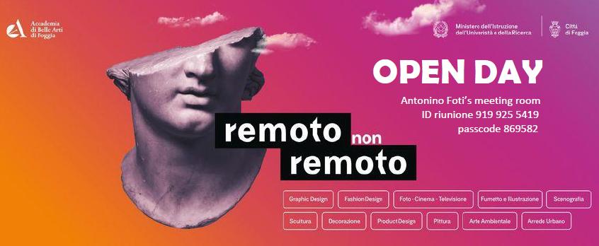 Si comunica che martedì 9 marzo 2021, dalle ore 10.00 alle ore 11.00, si svolgerà un incontro di orientamento post diploma a cura dei Docenti dell’Accademia di Belle Arti di Foggia, in modalità online.