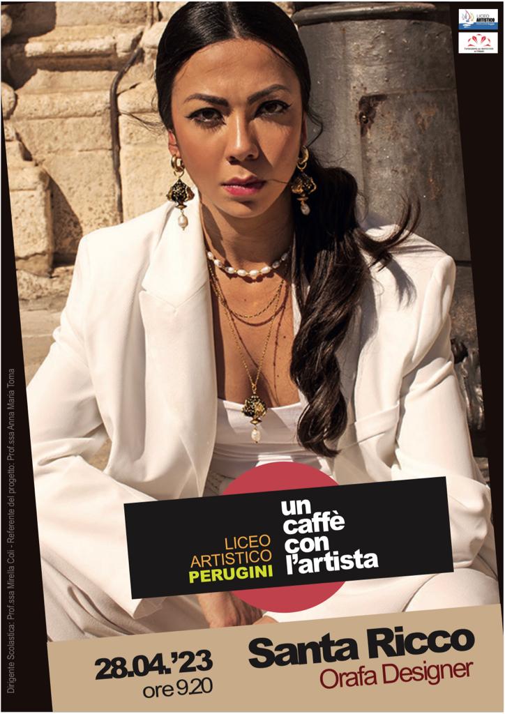 Si conclude con Santa Ricco il progetto del Liceo Artistico Perugini “un caffè con l’artista”. Una carrellata di appuntamenti mensili di artisti e creativi che hanno raccontato agli studenti il proprio percorso. Santa Ricco – Orafa Designer insieme al marito Moreno De Lauri – Visual Designer (entrambi ex studenti della scuola), hanno fondato una bottega artigiana, Santart, che fonde tradizione e innovazione. I due coniugi, realizzano piccolissime opere d’arte dipinte a mano creando gioielli inediti e originali da indossare. I gioielli Santart si trovano nelle aree shop di alcuni musei nazionali ed internazionali, oltre alla vendita online.
