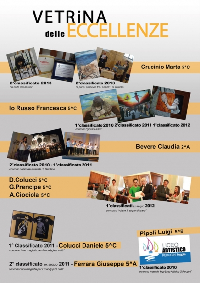 8 giugno 2013 LE NOSTRE ECCELLENZE Premiazione alunni anni 2010-2013. Il manifesto è stato realizzato da Carlo Guerra e Luigi Pipoli classe 5^B indirizzo Grafica. 4 dicembre 2011 CONCORSO: UN LOGO PER IL PUG DI FOGGIA (Piano Urbanistico Generale del Comune di Foggia) Palazzo di Città - Foggia PRIMO...