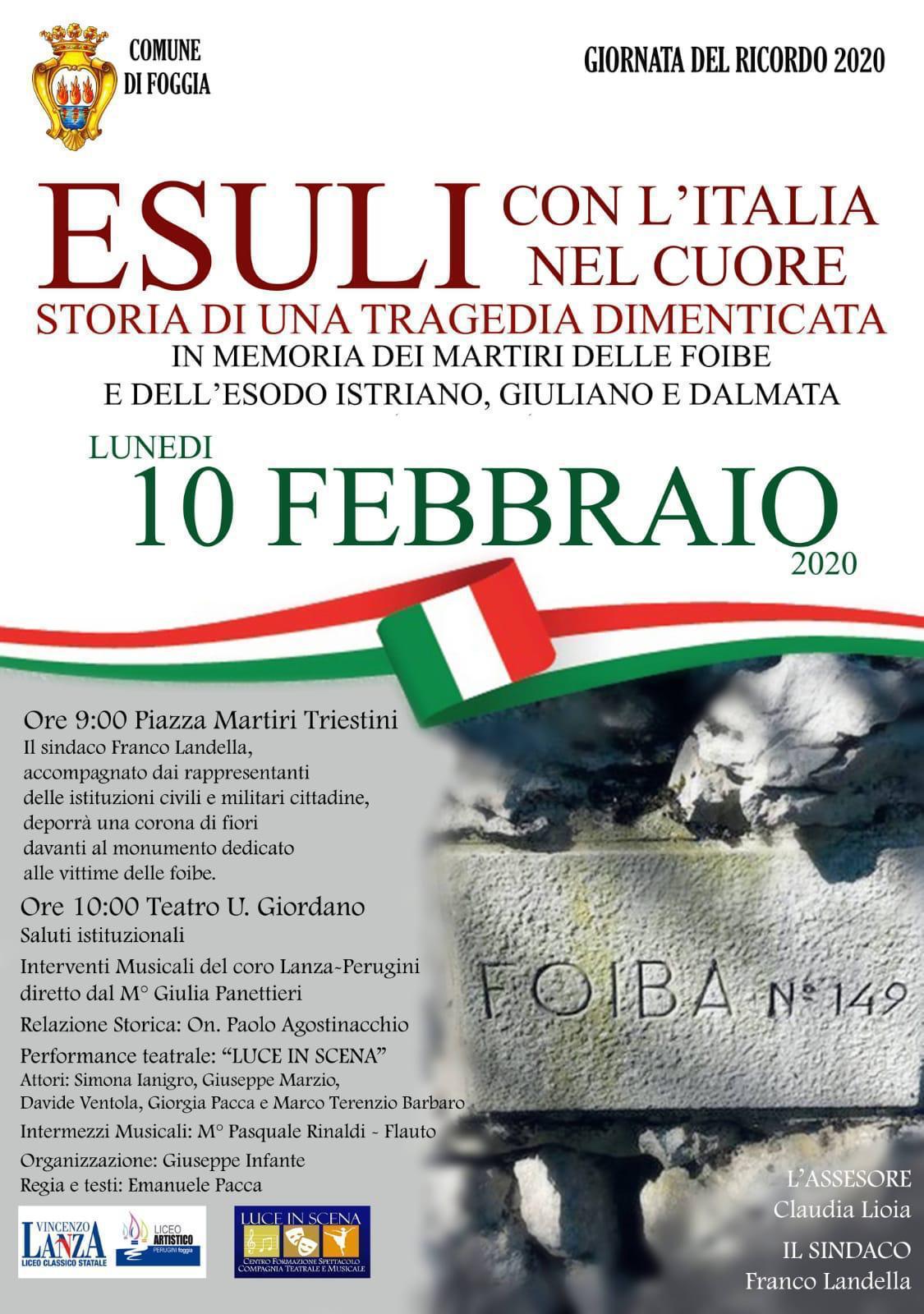 Lunedì’ 10 febbraio alle ore 10:00, il coro del Liceo “Lanza – Perugini” diretto dal la prof.ssa M° Giulia Panettieri parteciperà al Teatro “U. Giordano” alla giornata del ricordo 2020 in memoria “dei martiri delle Foibe”.